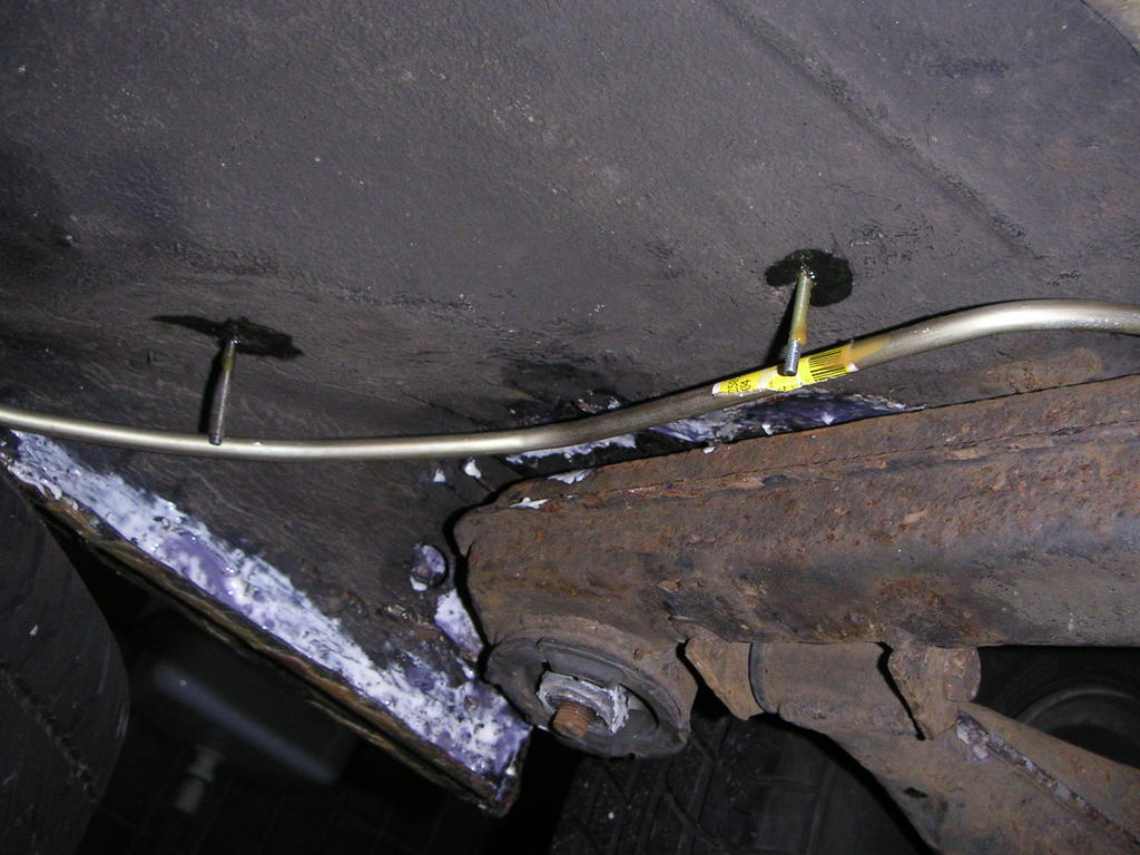 Wie oben im linken Bild schon zu sehen war, befindet das eine Ende ein Stück hinter dem Hinterachskörper. Von das aus verläuft die Leitung zwischen Hinterachskörper und Wagenboden (da laufen auch die beiden Rohrleitungen der Kraftstoffversorgung durch) nach vorne und an die Innenseite des Schwellers. Etwa in Höhe des Vordersitzes schwenkt die Leitung an den Längsträger und läuft dann zwischen Radhaus und Spritzwand in den Motorraum.